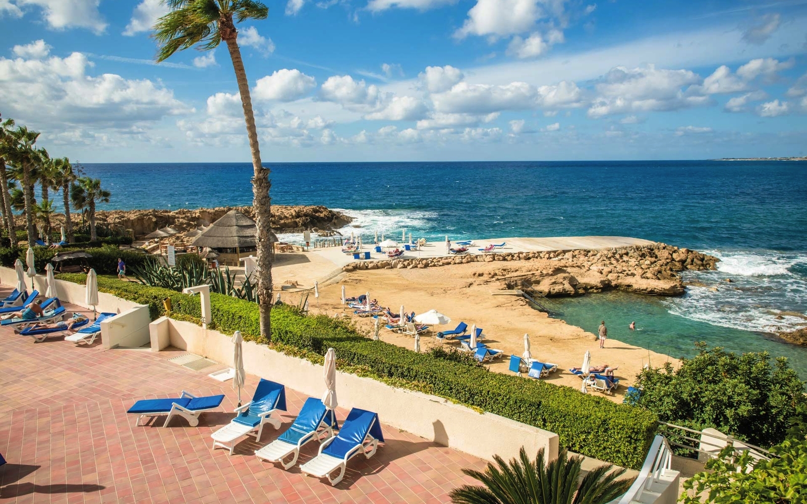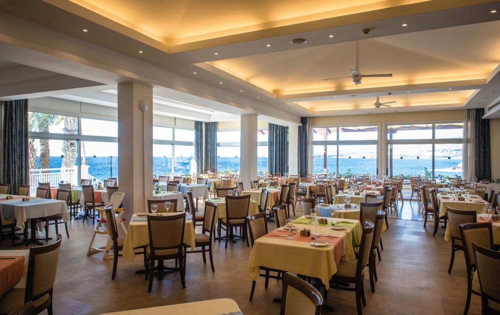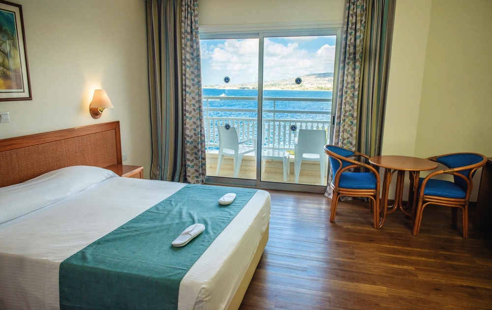 Das Hotel befindet sich auf einer kleinen Halbinsel, wodurch man von vielen Bereichen einen schönen Blick auf das Meer hat. Paphos erreichen Sie in nur wenigen Minuten mit dem öffentlichen Bus. Durch die familiäre Atmosphäre kommt man schnell in Urlaubsstimmung. Der Pool grenzt unmittelbar an eine Liegewiese mit Badeplateau und kleiner Bucht. Hier sind Liegestühle und Schirme inklusive. Außerdem befindet sich in dem Komplex noch ein Hallenbad. Mehrere Bars und das Hauptrestaurant mit kleinem Außenbereich sorgen für das leibliche Wohl. Ein Fitnessraum und ein leichtes Unterhaltungsprogramm bieten Abwechslung.