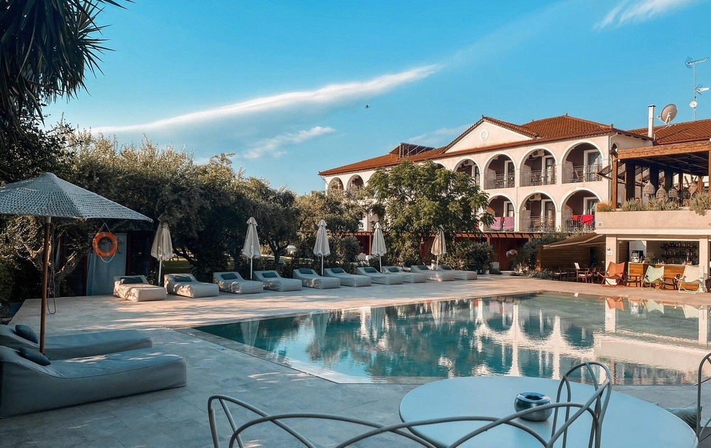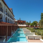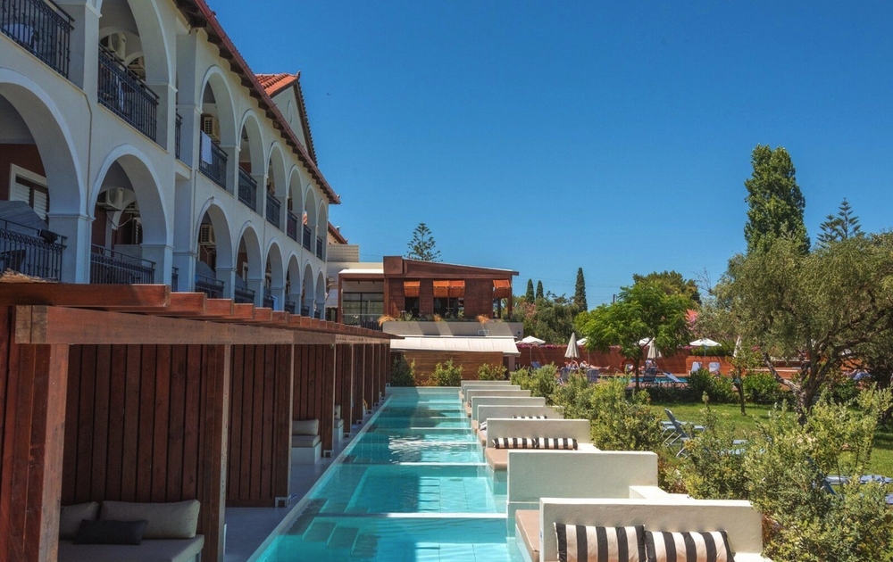 Das Hotel wurde in den letzten Jahren umfangreich renoviert und ist nun ein stylisches Refugium im Landhaustil für Gäste ab 16 Jahren. Etwas zurückversetzt gelegen sind es bis zum Strandanfang der Laganas Bay ca. 250 Meter. Diverse Restaurants stehen an diesem langen Strandabschnitt zur Verfügung. Die Anlage kombiniert moderne Elemente mit traditionellem Flair und ist ein perfekter, stillvoller Rückzugsort. Mit Liebe zum Detail möchte das Hotel dem Anspruch an Natur und Umfeld Rechnung tragen, was sich auch an den verschiedenen Angeboten vor Ort bemerkbar macht und das Hotel zu höchster Gästezufriedenheit bringt. Rund um den Pool stehen Liegen und Sonnenschutz kostenfrei zur Verfügung. Neben verschiedenen Bars werden im Restaurant regionale und überregionale Speisen serviert.