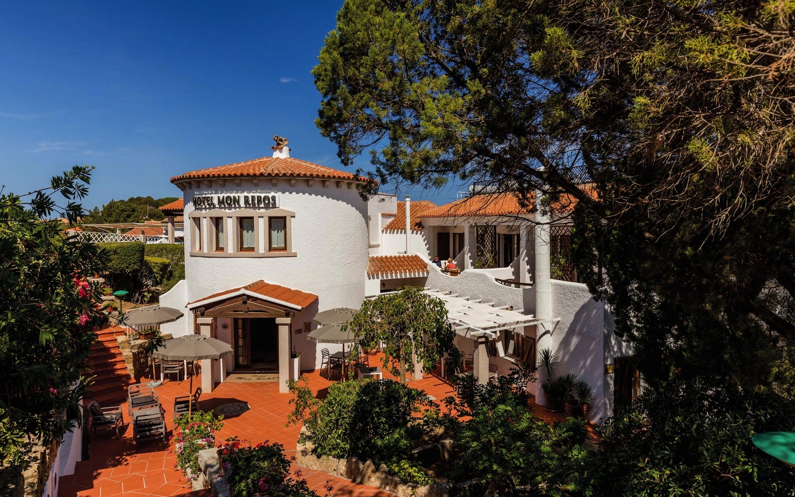Das charmante Hotel Mon Repos liegt in malerischer Lage in den Berg gebaut im beliebten Ort Baja Sardinia direkt an der traumhaften Costa Smeralda mit wunderschönem Blick auf die vorgelagerten Inseln. Zur Promenade von Baja Sardinia mit diversen Restaurants und Bars und zur wunderschönen Badebucht sind es nur ca. 150 Meter. Der Blick auf das türkisfarbene Meer wird Sie in seinen Bann ziehen. Das familiär geführte Hotel besteht aus mehreren sehr gepflegten Gebäudeteilen, die durch den schönen Garten erreichbar sind. Vom schönen Pool (saisonal, Liegen und Sonnenschutz inklusive) mit Bar hat man einen Blick auf die Umgebung und der Frühstücksraum mit Terrasse lädt zu einem guten Start in den Tag ein.