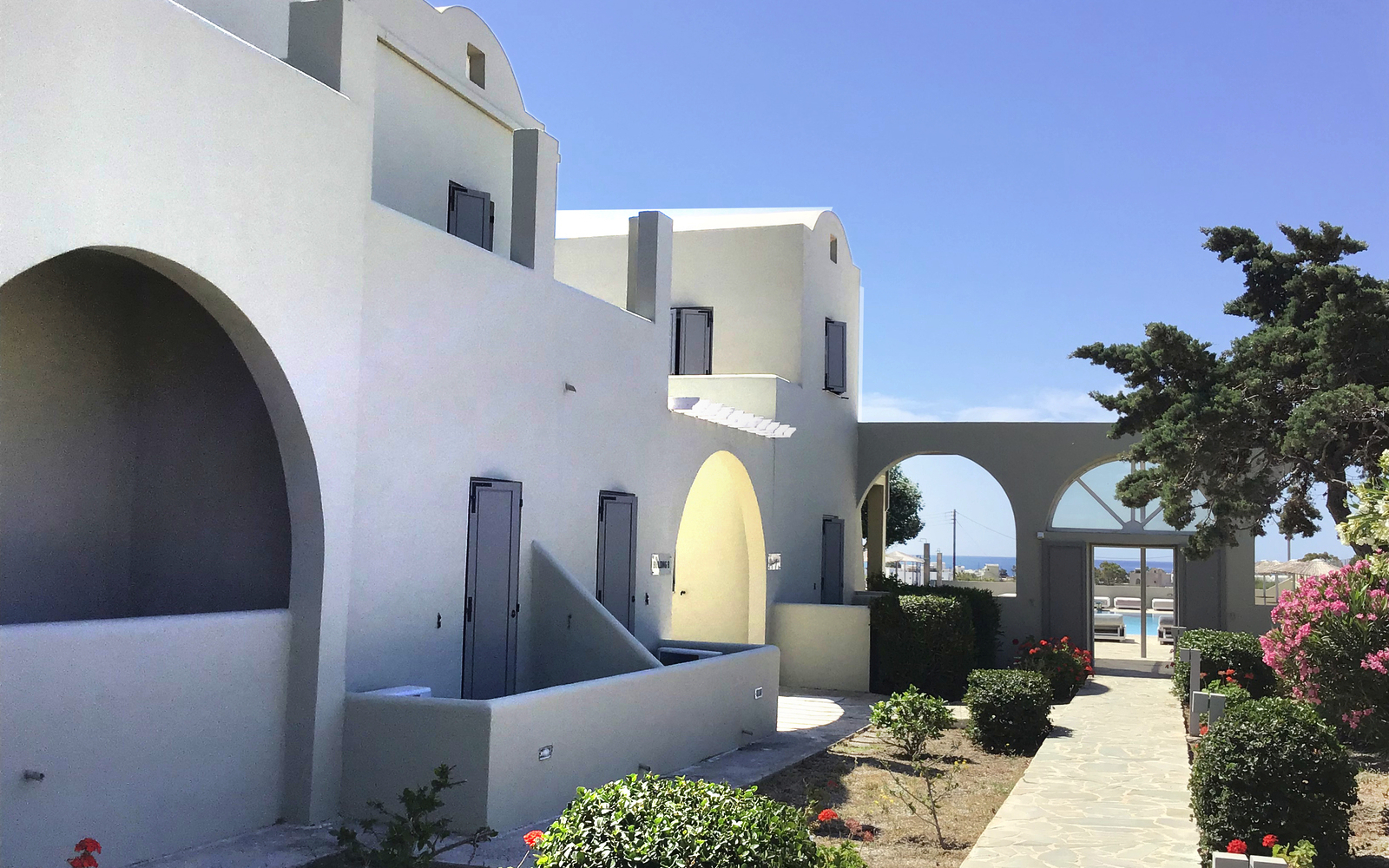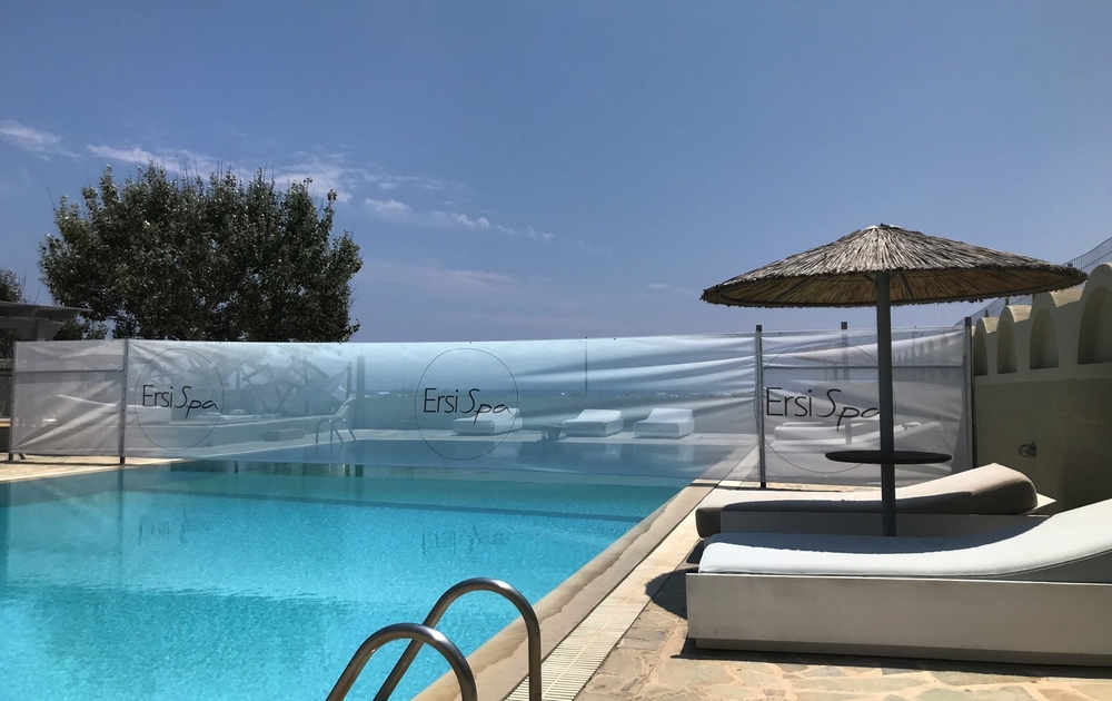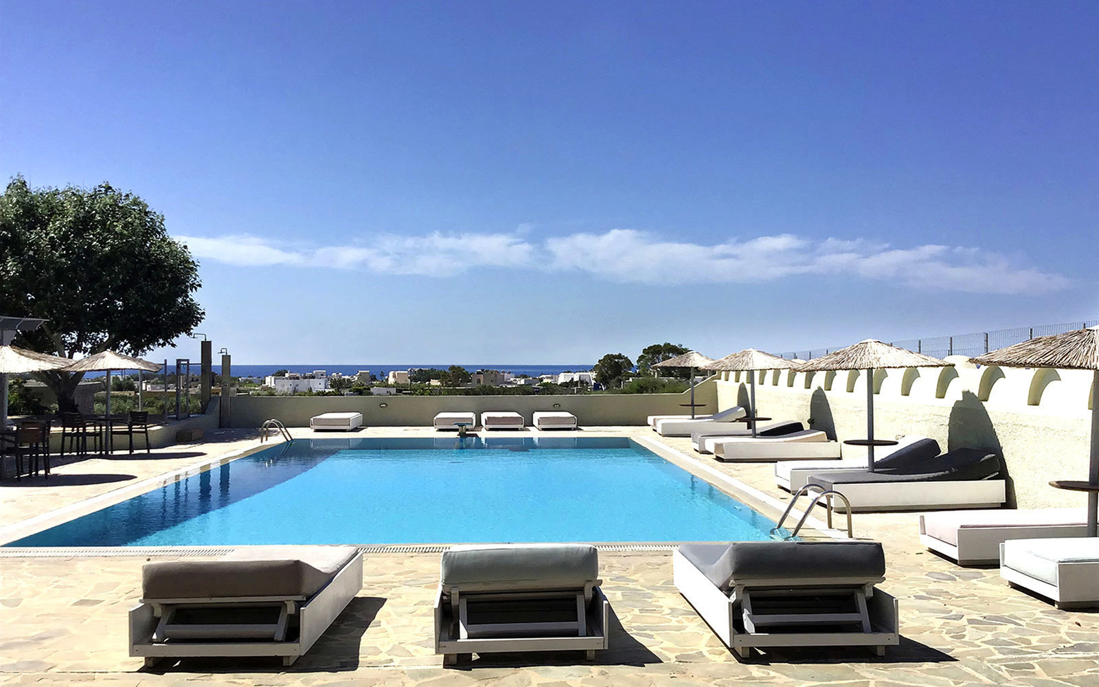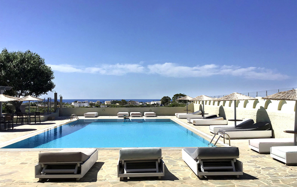 Das kleine und im Santorin Stil erbaute Resorthotel liegt zurückversetzt am Rand von Perissia, ca. 500 m vom Ortszentrum entfernt. Perissa ist für seinen schönen Lavastrand bekannt. Hier befinden sich diverse Tavernen und Restaurants. Den nächsten Strandabschnitt erreicht man nach ca. 700m. Am Pool stehen Liegen und Sonnenschutz zur Verfügung. Neben dem Frühstücksbereich gibt es im Hotel auch eine Pool/Snackbar.