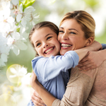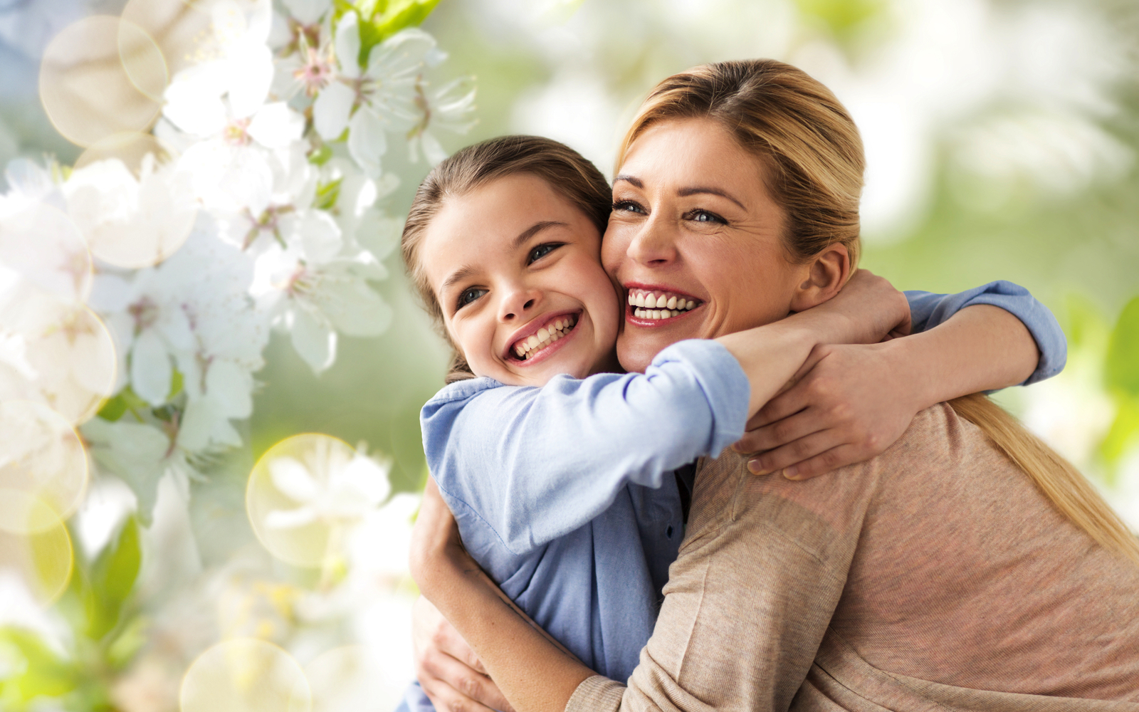 Leute- und Familienkonzept - glückliche lächelnde Mutter, die Tochter über Kirschblütenhintergrund umarmt ©Syda Productions - stock.adobe.com